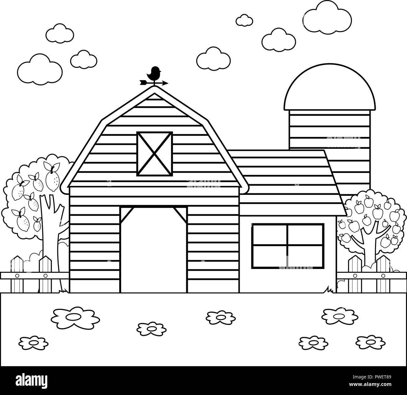 Paysage Avec Grange Ferme D Une Cloture Et D Arbres De Vergers Livre De Coloriage Noir Et Blanc La Page Image Vectorielle Stock Alamy