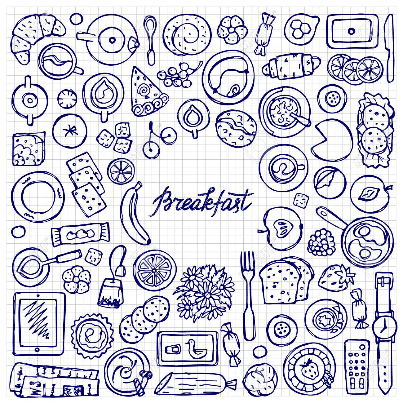 Griffonner Motif Petit Dejeuner Seamless Flat Composition Laique Avec Le Lettrage Vue De Dessus De La Nourriture Des Boissons Et Des Equipements De Cuisine Coloriage Clip Art Libres De Droits Vecteurs